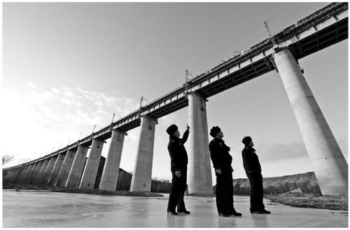 冬季瑟尔基河冰封,桥下经常有人穿行。为防止桥上石砟因火车经过震动落下砸到人,民警经常踏冰巡视。