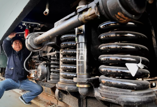 张军富在检查紧固车底下部锅炉排水栓、集尘器丝堵。
