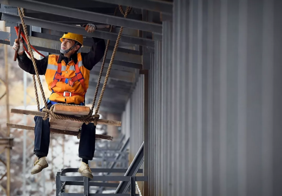 李玉斌坐在悬空的木板上对桥梁人行道钢构架托架进行检修。