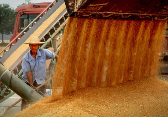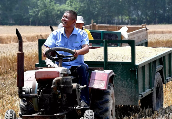 樊军亭开着装满小麦的拖拉机驶出麦田。