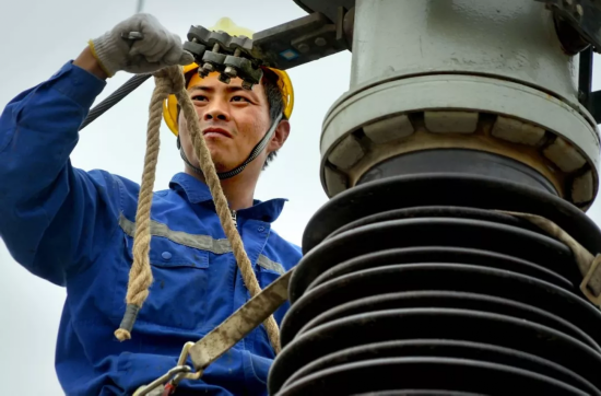 中国铁路郑州局集团有限公司新乡供电段工作人员在河南淇县牵引变电所进行高空作业。