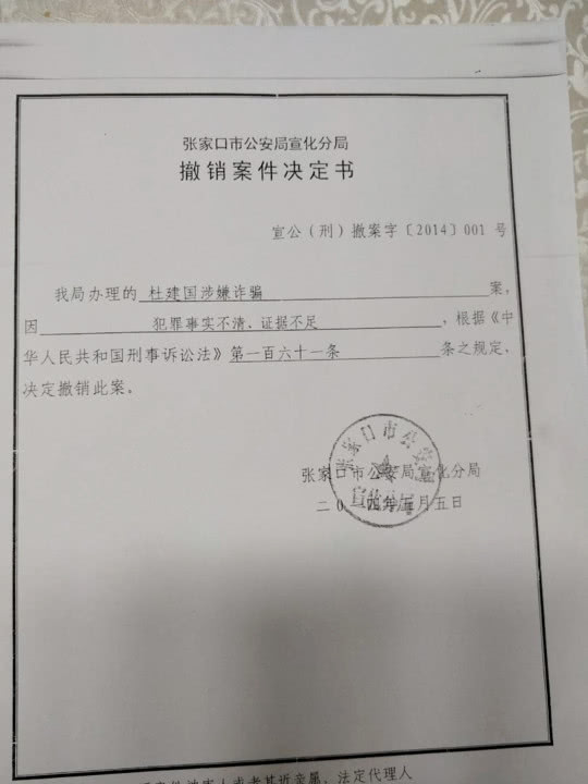 同样,杜建国案也以“事实不清、证据不足”为由,于当年5月5日,被宣化分局决定撤案。