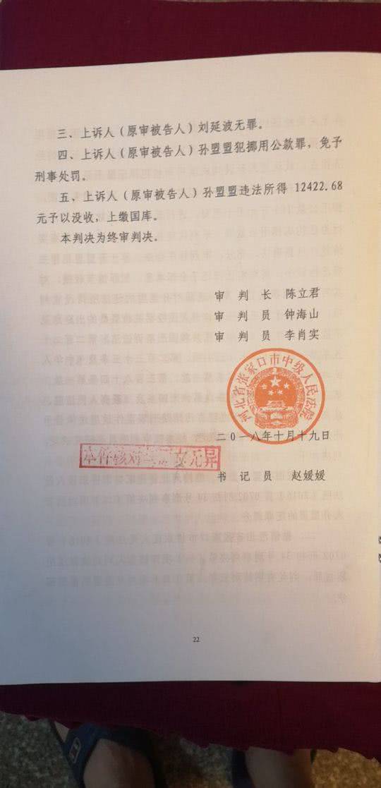 2018年10月19日,张家口市中级人民法院没有再发还重审,而是直接作出二审判决,认定刘延波无罪,孙盟盟免予刑事处罚。