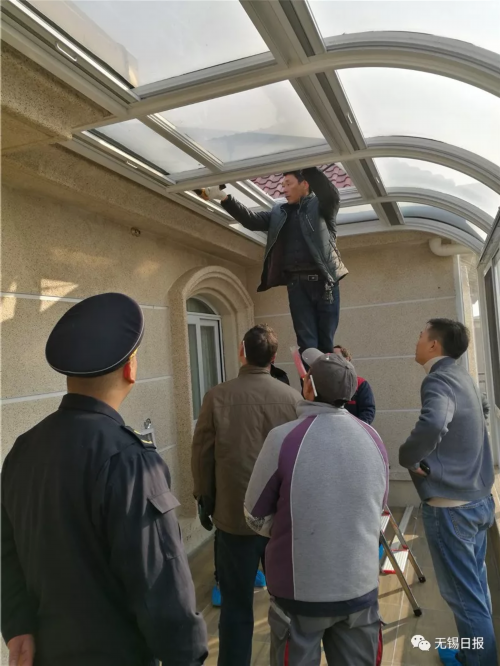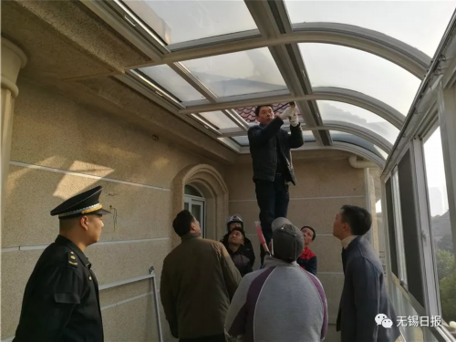 1月24日上午,在惠山区华府庄园一区228号三楼,几名拆违工人使用简易工具,踩在梯子上小心翼翼地对违建阳光房进行拆解,拉开了今年惠山区别墅区违法建设整治行动的序幕。