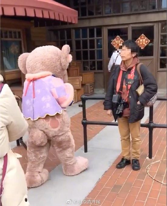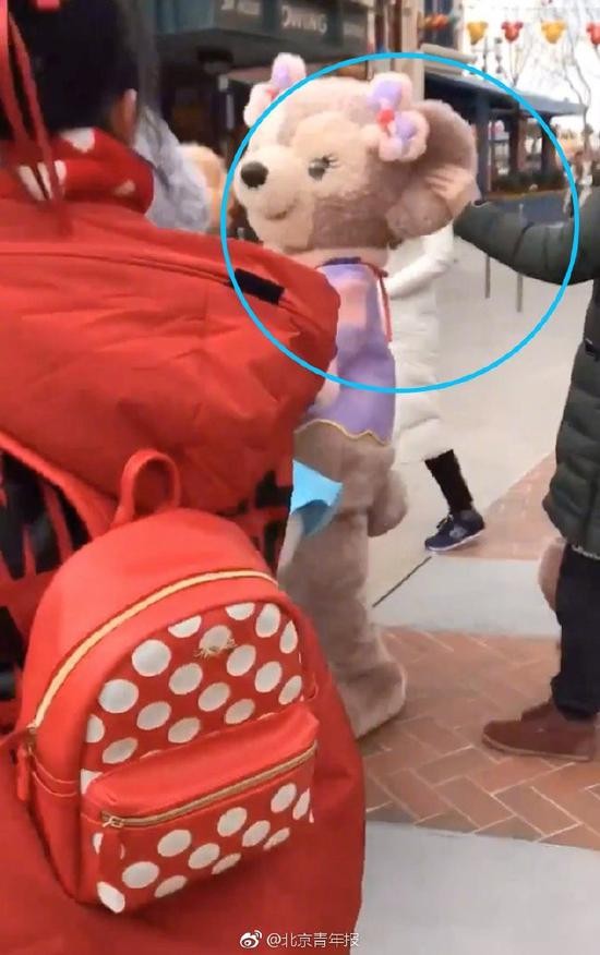 北青报记者从目击者处获悉,事件发生在1月26日。“当时迪士尼的小熊‘雪莉玫’人偶和小伙伴牵手走出来,和路人挥手、击掌,突然之间玫玫的头套被拽了一下,之后玫玫就在工作人员的陪同下去了休息室。”