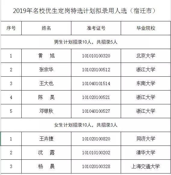 根据《江苏省2019年名校优生定岗特选计划选调公告》,按照素质测试、综合考察4:6比例进行综合计分,分职位从高分到低分确定441名拟录用人选,根据1:1.5差额考察比例相应调减部分选调计划,其中面向15所名校选调315人、面向省内高校选调126人。拟录用人选体检将于2月底前后在南京进行,具体时间、地点另行通知,请保持通讯工具畅通。考察人选即日起可登录江苏省人力资源和社会保障网人事考试服务专栏查询成绩(综合成绩=素质测试分数*100*40%/150+综合考察分数*60%)。