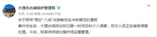 中新网1月28日电 近日,一段“‘悟空’和‘八戒’联手与一男子街头互殴”的视频引发社会关注,有网友称事发是在大理古城。今日,针对此事,云南大理市古城保护管理局通过官方微博回应称,事件发生后,大理古城派出所已第一时间及时介入调查,双方人员正在接受调查处理。今后,云南大理市古城保护管理局将持续加强市场监督管理。