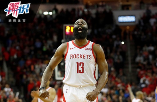 2019年1月14日,哈登砍下38分9板12助,延续着自己的30+记录。