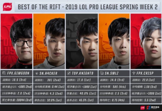 腾讯体育1月28日讯 英雄联盟官方公布了2019LPL春季赛第二周最佳阵容:上单FPX.Gimgoon、打野SN.H4cker、中单TOP.Knight、下路SN.Smlz和FPX.Crisp。