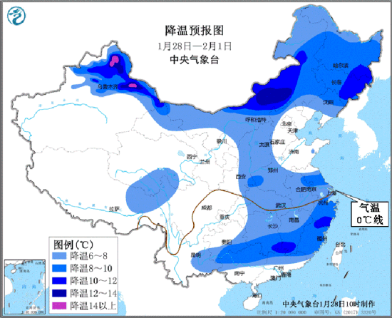 受强冷空气影响,我国大部地区气温将下降4~8℃。新疆北部、内蒙古中东部、吉林东部以及江南等地部分地区降温幅度可达10℃以上;中东部地区最低气温出现在2月1日早晨,气温0℃线将位于长江中下游一线。西北地区东部及长江中下游以北地区将有4~6级偏北风,新疆风口风力达9~11级,南疆盆地、内蒙古中西部局地有沙尘天气;我国东部和南部海区将有7~8级大风。