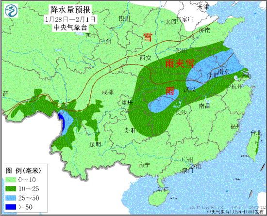 预计1月28日至30日,新疆北部、青藏高原、甘肃、宁夏、陕西中北部、山西等地部分地区将有小雪或雨夹雪,局地中雪;陕西南部、湖北北部和中西部、河南、山东中南部、苏皖中北部等地将有雨转雪或雨夹雪,部分地区有大到暴雪,降雪主要出现在30日夜间;湖北东部、江苏和安徽等局地有大雨。这次过程对入冬以来降水偏少的华北、东北大部地区仍无转折变化。另外,28日至29日,云南西北部有中到大雨、局地暴雨。