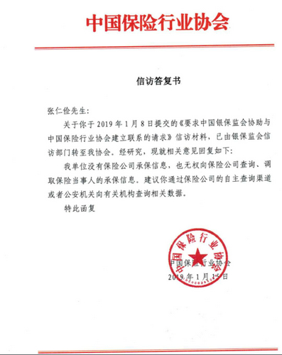 2019年1月15日,中国保险行业协会回复小洁父亲称:“我单位没有保险公司承保信息,也无权向保险公司查询、调取保险当事人的承保信息。建议你通过保险公司的自主查询渠道或者公安机关向有关机构查询相关数据。”
