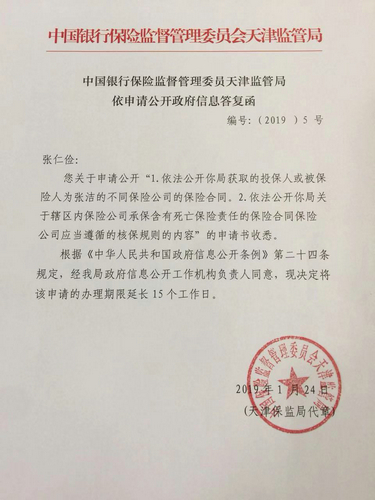 2019年1月24日,天津保监局向小洁父亲出示了《中国银行保险监督管理委员(会)天津监管局依申请公开政府信息答复函》。该《答复函》称:“根据《中华人民共和国政府信息公开条例》第二十四条规定,经我局政府信息公开工作机构负责人同意,现决定将该申请的办理期限延长15个工作日。”