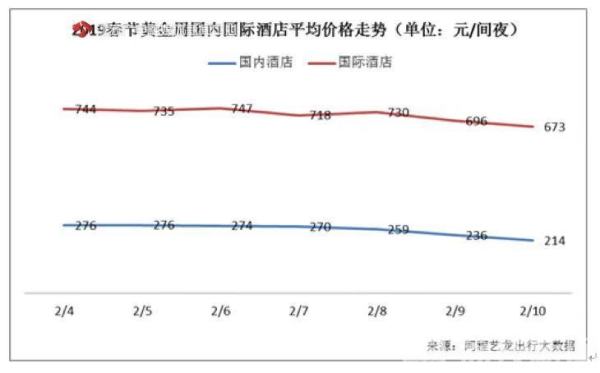 大数据显示,春节黄金周期间国内酒店的平均房价在214元每间夜至276元每间夜之间波动,除夕至大年初二的平均房价最高。国际酒店平均房价则在673元每间夜至747元每间夜之间波动,以除夕夜和大年初二的房价最高。