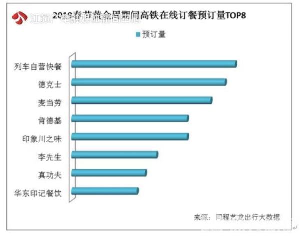 春节黄金周期间乘坐火车长途旅行,难免要在车上用餐,坐火车吃什么也是大家比较关心的话题。在各大平台的高铁订餐服务推出后,除了泡面+火腿肠这样的“经典组合”外,旅客们还可以在列车上吃到南北菜系和中西风味的佳肴。春节黄金周期间,列车自营的快餐盒饭预订量最大,其次是德克士、麦当劳、肯德基等西式快餐,一些主打川菜风味的餐饮品牌也颇受欢迎。目前,消费者在预订车票的同时可以顺便订好车上的餐食,商家可以在沿途的车站提供配送服务。