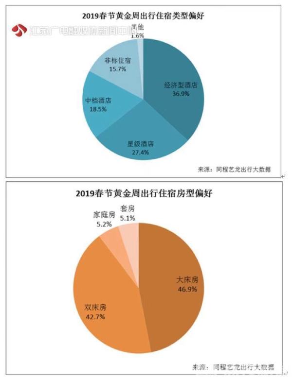 《春节出行报告》显示,春节黄金周期间消费者的住宿需求非常多元化,整体以经济型快捷酒店为主,占比36.9%,其次是星级酒店(五星至一星),占比27.4%,每间夜平均400至500元之间的中档酒店(全季、和颐、桔子水晶等)也颇受欢迎,占比18.5%。另外,民宿、客栈、度假别墅及公寓式酒店等非标住宿也很受欢迎,占比15.7%。房型偏好方面,需求量最大的房型为大床房和双床房。