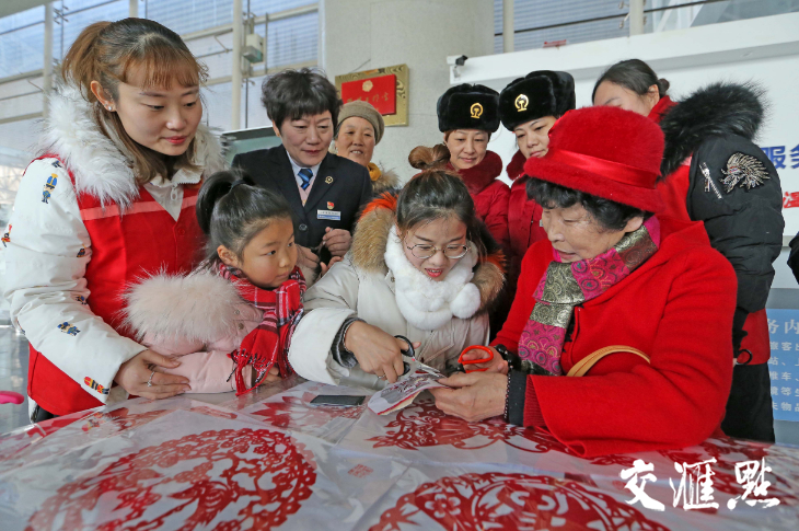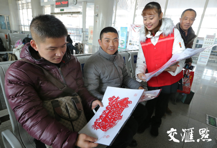 2019年1月26日,连云港市海州湾街道党员志愿者和民间剪纸艺人来到连云港火车东站,把2000多张“福”字和生肖猪剪纸作品赠送给旅客,让旅客春运路上带“福”回家。
