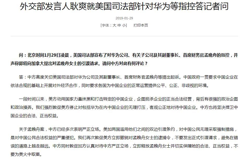 问:北京时间1月29日凌晨,美国司法部宣布了对华为公司、有关子公司及其副董事长、首席财务官孟晚舟的指控,并声称即将向加拿大提出对孟晚舟女士的引渡请求。请问中方对此有何评论?