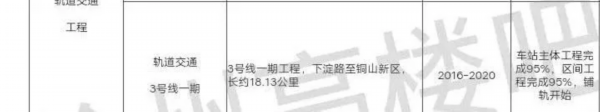 3号线一期工程,下淀路至铜山新区,长约18.13公里,建设年限2016-2020年,今年车站主体工程完成95%,区间工程完成95%,铺轨开始。