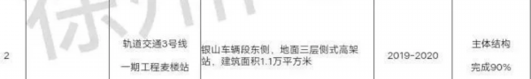 3号线一期向南延伸一站,增设麦楼站,银山车辆段东侧,露面三层侧式高架站,建筑面积1.1万平方米。建设年限为2019-2020年,今年主体结构完成90%。目前3号线已经封顶的车站有:科技广场三胞段(部分封顶)和湘江西路站(现为浦江路站)、大庆路站(现为白云山站)、银山站(高新区南站)、师范大学站。