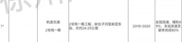 轨道交通2号线一期,新台子站至新区东站、长约24.25公里。建设年限2016-2020年。今年实现洞通,铺轨85%,车站安装及装修完成80%。