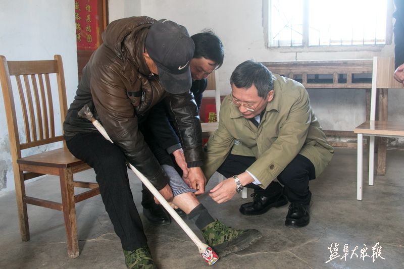 戴源慰问低收入户残疾人周序年,察看他的伤口。
