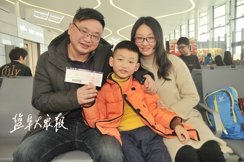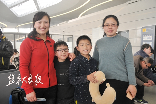 △赵春(前排右一)和丈夫、孩子从泰州赶到盐城坐飞机。