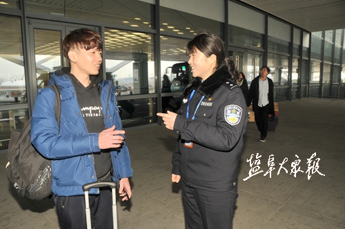 △机场边检站民警朱紫彤为首飞来盐的台湾小伙热情服务。