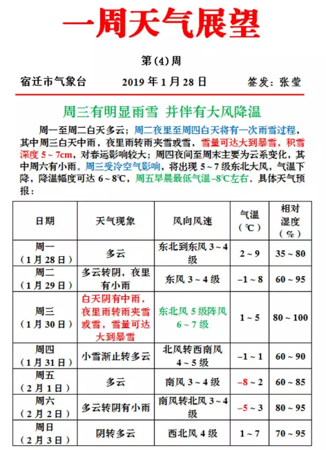 本周已经进入“五九”,俗话说,“三九四九冰上走,五九六九沿河看柳”。不过,从今年的情况来看,宿迁人却过了一个相当暖和的“四九”,“五九”反而要冷了。速速从宿迁市气象局了解到,本周周一至周二白天多云;周二夜里至周四白天将有一次雨雪过程,其中周三白天中雨,夜里雨转雨夹雪或雪,雪量可达大到暴雪,积雪深度5到7cm,对春运影响较大;周四夜间至周末主要为云系变化,其中周六有小雨。周三受冷空气影响,将出现5到7级东北大风,气温下降,降温幅度可达6到8℃,周五早晨最低气温-8℃左右。