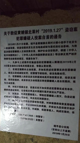 对此,1月29日晚,北莱村当地村民给北京青年报记者发来一份由昭平县公安局张贴的“关于敦促黄姚镇北莱村‘2019.1.27’盗窃案犯罪嫌疑人投案自首的通告”。通告称,1月27日凌展,昭平县黄姚镇北莱村大银小组亭子处发生一起盗窃案,该盗窃案的发生在当地造成较为恶劣的社会影响。为敦促涉案犯罪嫌疑人主动投案自首,维护社会治安秩序,根据《中华人民共和国刑法》、《中华人民共和国刑事诉设法》等法律及宽严相济刑事司法政策的规定,现通告如下: