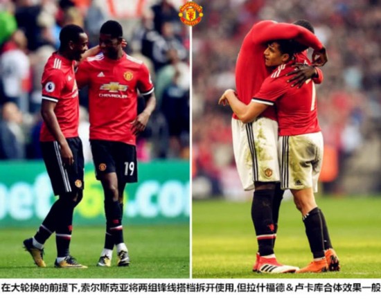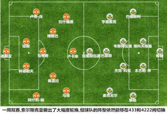 索尔斯克亚对上周末对阵阿森纳的首发阵容做出了五处调整,拉什福德回归首发,他的锋线搭档由马夏尔和林加德换成了卢卡库与马塔,博格巴和马蒂奇承担着连续作战的任务,埃雷拉得到了轮休机会,顶替他位置的球员是佩雷拉。索尔斯克亚准备利用近期相对轻松的赛程进行轮换,为2月中旬的魔鬼赛程积蓄能量。