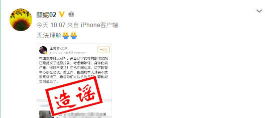 然而,就在北京时间1月30日,颜妮本人在其个人微博分享昨天造谣者的微博并称无法理解,此外,在昨天造谣者的微博上还打上了大大的“造谣”二字,亲自发文打脸造谣者。