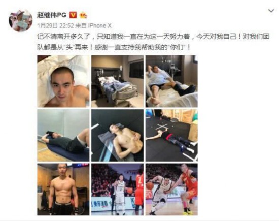 “记不清离开多久了,只知道我一直在为这一天努力着,今天对我自己!对我们团队都是从“头”再来!感谢一直支持我帮助我的“你们”!”昨晚,赵继伟在社交网络分享自己的心路历程。从发布的照片上看,这明显是他从手术后康复阶段到参加正式比赛的过程,其中的艰辛只有他自己最清楚。