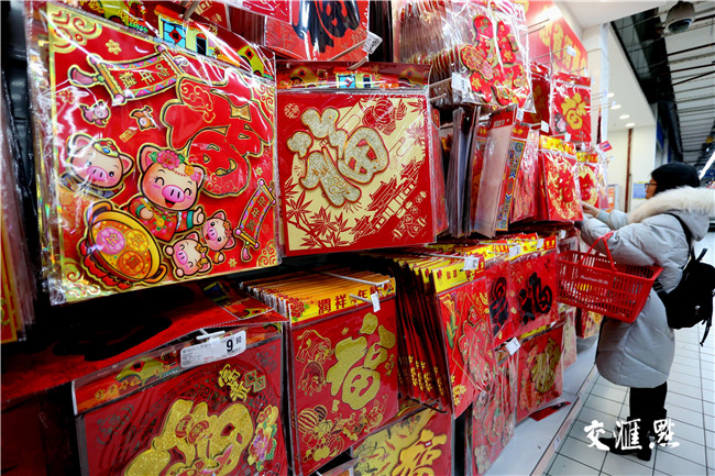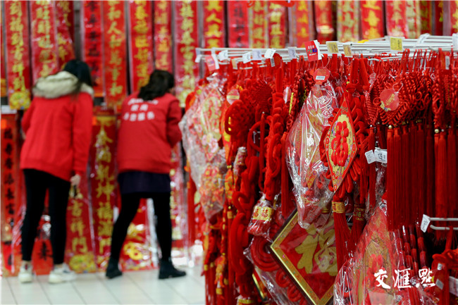 1月29日,南京河西一大型超市内新年饰品区挂满了“福”字、春联等各种喜庆饰物,前来选购的市民络绎不绝。