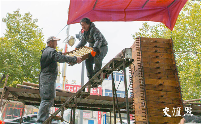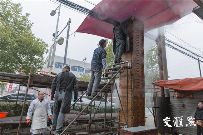 1月19日,如皋市石庄镇,一家蒸馍店44层的蒸笼正在蒸市民加工的新年馒头,5米多高的蒸笼塔让人惊叹不已。