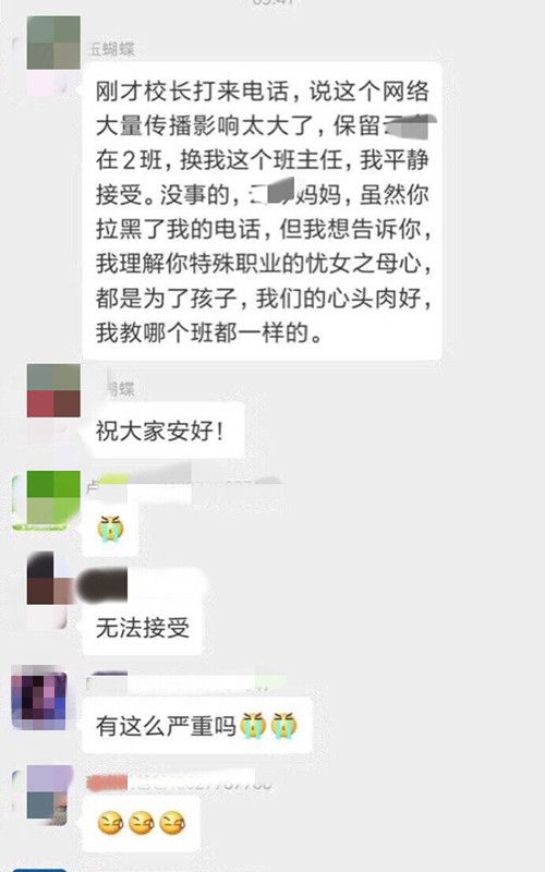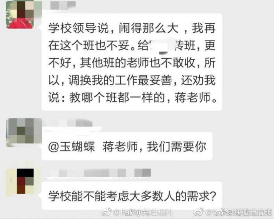 此外,蒋玉芬还表示,学校领导称,事情闹那么大,她再在这个班也不妥,给当事学生转班更不好,其他老师也不敢收,所以调换她的工作最妥善。“校长打来电话,说保留该学生在三年二班,换我这个班主任,我平静接受。没事的,虽然家长拉黑了我的电话,但我理解你特殊职业的忧女之母心,都是为了孩子,我教哪个班都一样的。”