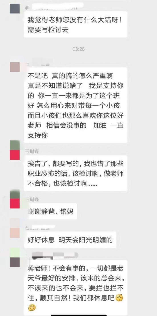 对于蒋玉芬在三年二班家族群中的这些说法,有的家长对她表示安慰和支持,并有家长认为“老师没有什么大错,需要写检讨的”。此外,还有多名家长对于该老师不能再担任三年二班班主任一事表示“无法接受”,并认为“一个人影响了54个人,54个家庭”。