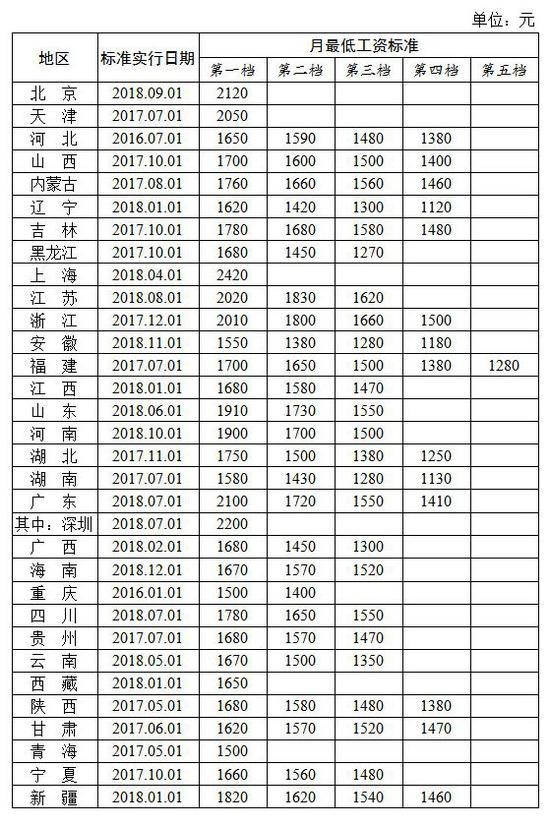 1月10日,人社部网站公布了全国各地区月最低工资标准情况(截至2018年12月):