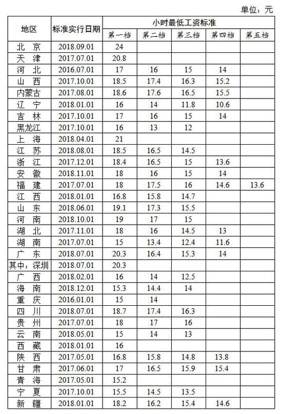 1月10日,人社部网站公布了全国各地区小时最低工资标准情况(截至2018年12月):