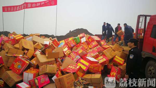 今天(1月30日)上午,6辆大货车将2600余件前期收缴的烟花爆竹运至江苏亚邦矿业有限公司,常州市公安局会同安监、消防等部门在矿区空地对前期收缴查处的2600余件非法烟花爆竹进行集中销毁。