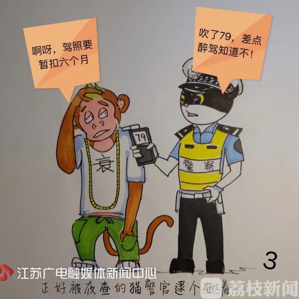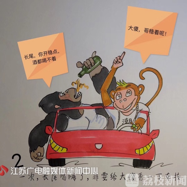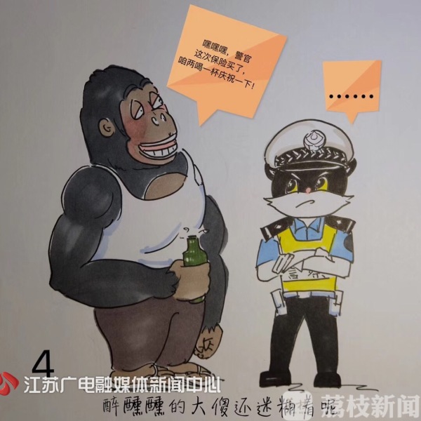 今年28岁的朱豪杰自小就爱画画,工作后也没丢下画笔,目前已画了100多幅交通宣传漫画。队里专门为他开辟了工作室,便于他利用空余时间创作。他的作品大多幽默风趣,像这篇"疯狂动物城"系列,用猴子和猩猩醉驾后,被黑猫警长处罚的故事,提醒大家不要酒后驾驶。