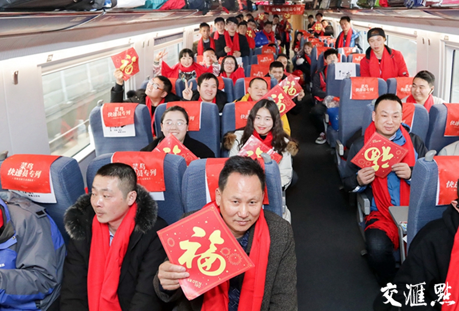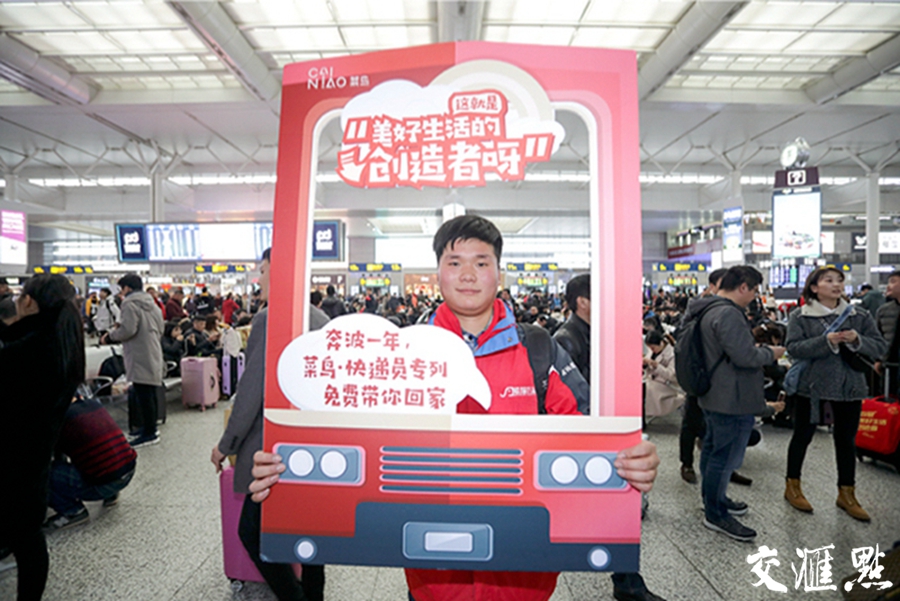 2019年1月30日13时10分,上海虹桥站,承接2019年菜鸟快递员专列的G9402列车缓缓驶出,400来名快递员及家人,踏上了回到家乡与家人新春团聚的旅程。