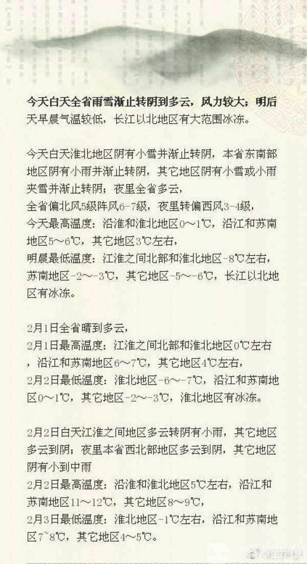 目前,全省基本无降雪,局部地区会有小阵雨或雨夹雪。暴雪算是翻篇了,但是迎面而来的是气温骤降和严重冰冻。韩桂荣说,全省降温幅度达六度,还将继续下滑,“2月1号江苏气温最低,淮北地区基本上会在零下九度。全省东南部地区可能会在零下二到零下三度。大部分地区会有冰冻,可能会对春运交通产生影响。”