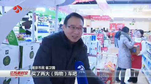 南京市民崔卫国告诉记者,买了两大购物车,回老家过年嘛,孝敬孝敬老人。