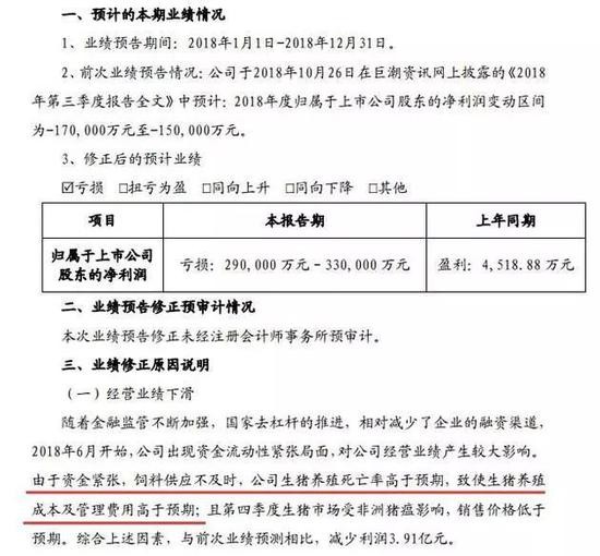 公司披露,由于资金紧张,饲料供应不及时,公司生猪养殖死亡率高于预期,叠加其它因素影响,公司较前次预测相比减少利润3.91亿元。