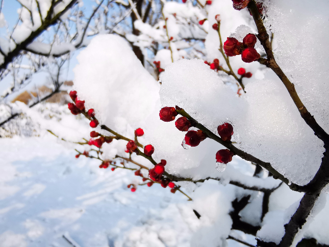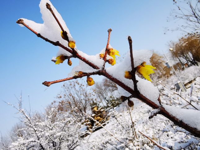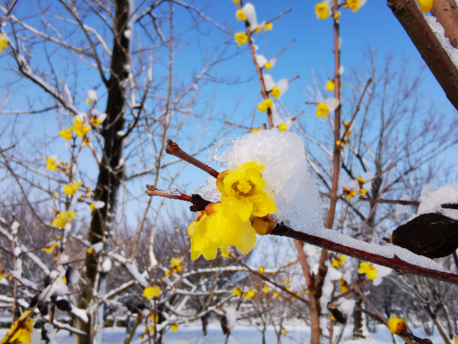 1月31日,东海县雪后初晴,西双湖风景区腊梅花、红梅等花卉迎着风雪、顶着寒风绽放,格外鲜艳,成为了白雪中的一道靓丽风景。