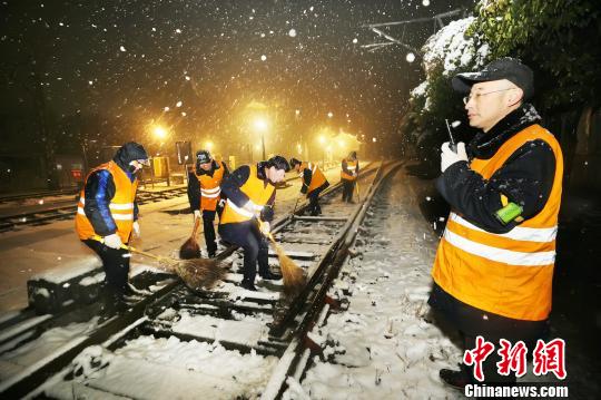 1月30日晚,苏皖地区降雪,徐州机务段干部职工连夜清除机车整备场道岔上的积雪。 李文伟 摄