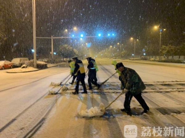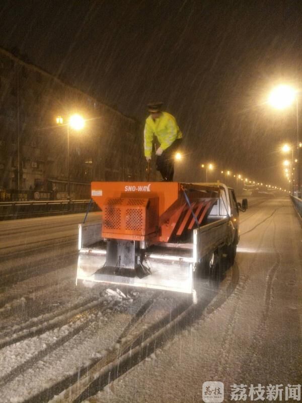 1月31日凌晨,南京开始飘起雪花。截至7时,南京六合雪量24.1毫米,雪深5厘米。为保障市民出行安全,六合区从1月30日晚启动扫雪防冻应急预案,扫雪防冻指挥部的各成员单位随时待命,彻夜不停扫雪除冰。