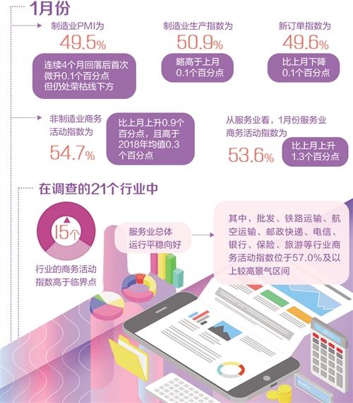 1月31日,国家统计局服务业调查中心和中国物流与采购联合会发布了中国采购经理指数。1月份,制造业PMI为49.5%,比上月微升0.1个百分点;非制造业商务活动指数为54.7%,比上月上升0.9个百分点;综合PMI产出指数温和上涨,超过去年四季度高点。