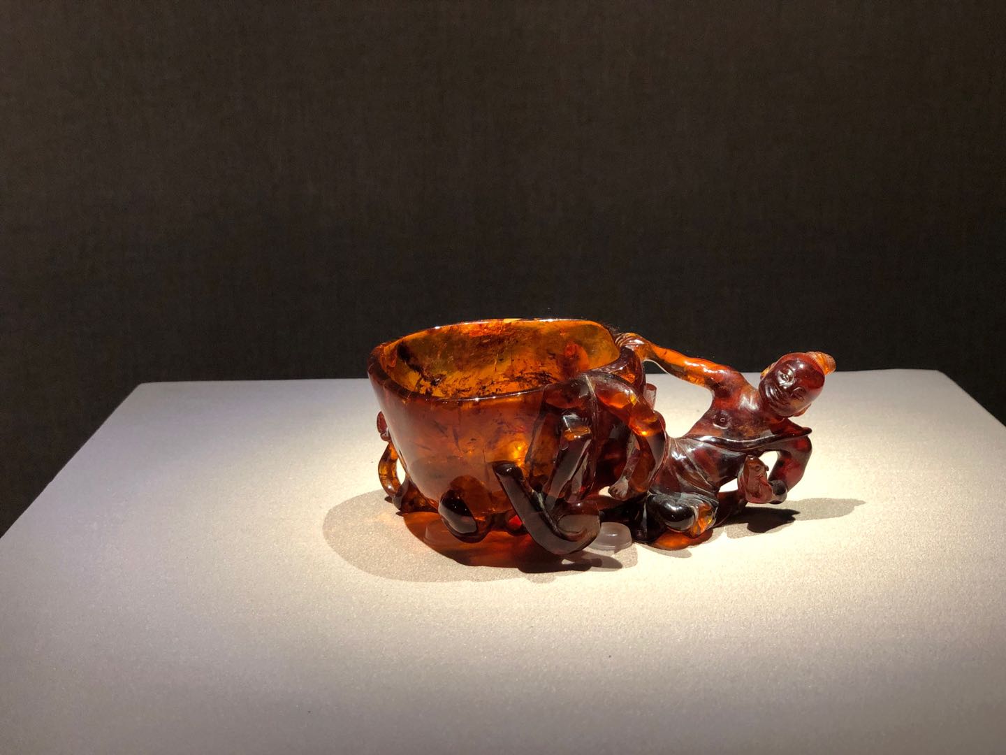 旁边的展柜中有一件珍贵的琥珀杯,在灯光的照射下透着红葡萄酒一样的晶莹剔透。琥珀杯的杯身被荷花的茎叶环绕,一侧浅雕着一只鱼鹰,圆睁的眼睛似乎在寻找猎物,另一侧是一位裸露上身的渔翁,一手攀住杯口,一手紧握着一条正在挣扎的鱼。据介绍,这是文物出自明代开国功臣沐英的第十一世子孙沐启元墓,是国宝级文物。